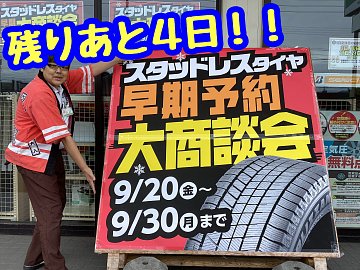 こんにちは! 今日は、今月最後のタイヤセールのお知らせです! 9月30日までとなりました スタッドレスタイヤ早期予約大商談会! 日々大盛況ありがとうございます!! セール情報はこちら 在庫限りではありますが、 アウトレット商品等のお買い得商品も まだまだあります!! ぜひこの機会にご来店...