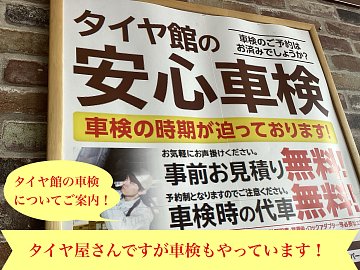 こんにちは! 種綿です! 本日は、 車検についてです! タイトルにもある様に、 当店、タイヤ館、 車検もお取り扱いしております! タイヤ屋さんで車検って専門外なのに?? と思われる方もいるかと思います! その点もご安心ください! 当店の車検は 車検整備認証工場への 外注委託になっておりま...