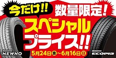 こんにちは! 店長のきむらです! 本日から2つのイベントが同時開催!!! ①今だけ!!数量限定!!スペシャルプライス!! 5月24日(金)~6月16日(日)までの期間限定! 対象商品は・・・ ブリヂストン製 夏用乗用車タイヤ ①ECOPIA NH200・NH200C! 商品紹介はコチラ(NH200シリーズ) ②NEWNO! ...
