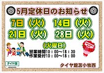 いつもタイヤ館苫小牧西店をご利用いただき 誠にありがとうございます。 2024年5月の定休日をご案内いたします。 5月 7日(火) 定休日 5月 14日(火) 定休日 5月 21日(火) 定休日 5月 28日(火) 定休日 ゴールデンウィーク中も毎日営業しておりますので ご来店の際はお間違えの無...