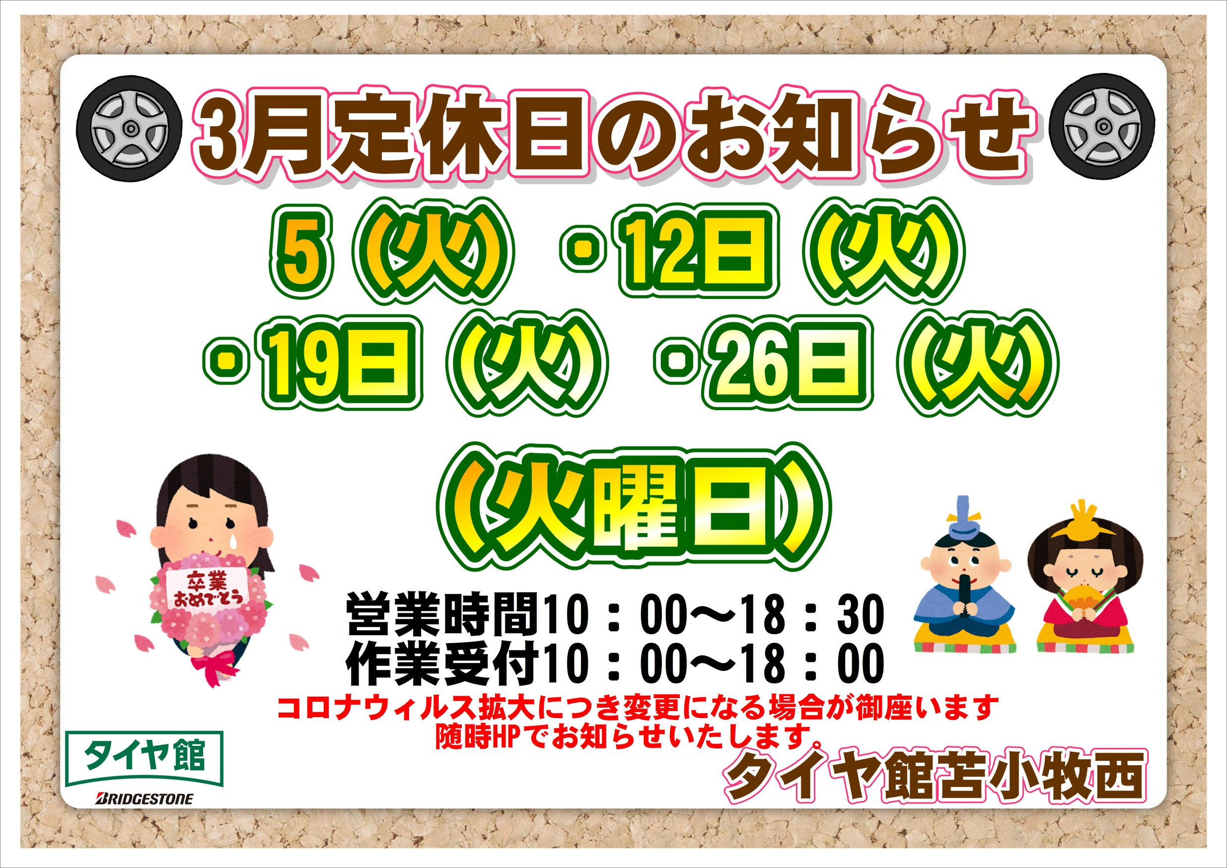 いつもタイヤ館苫小牧西店をご利用いただき 誠にありがとうございます。 2024年3月の定休日をご案内いたします。 3月 5日(火) 定休日 3月12日(火) 定休日 3月19日(火) 定休日 3月26日(火) 定休日 毎週火曜日が定休日でございますので ご来店の際はお間違えの無いようお願いいたします。 た...