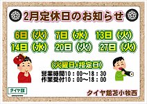 いつもタイヤ館苫小牧西店をご利用いただき 誠にありがとうございます。 2024年2月の定休日をご案内いたします。 2月 6日(火) 定休日 2月 7日(水) 臨時定休日 2月13日(火) 定休日 2月14日(水) 臨時定休日 2月20日(火) 定休日 2月27日(火) 定休日 毎週火曜日以外にも定休日がありま...