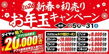 旧年中はコクピット・タイヤ館をご利用いただき、誠にありがとうございました。 本年もお客様の安全・安心なカーライフの為、一層努力してまいりますので、 引き続き宜しくお願い申し上げます。 いつもコクピット・タイヤ館をご愛顧いただいているアプリ会員様限定で 新春初売りお年玉キャンペーン...