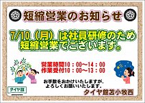 いつもタイヤ館苫小牧西店をご利用いただき 誠にありがとうございます。 本日は短縮営業です その他の定休日は以下の通りでございます。 7月 4日(火) 定休日 7月 10日(月) 社員研修のため 10:00~14:00までの短縮営業(受付は13:00まで) 7月 11日(火) 定休日 7月 12日(水) 臨時...