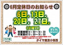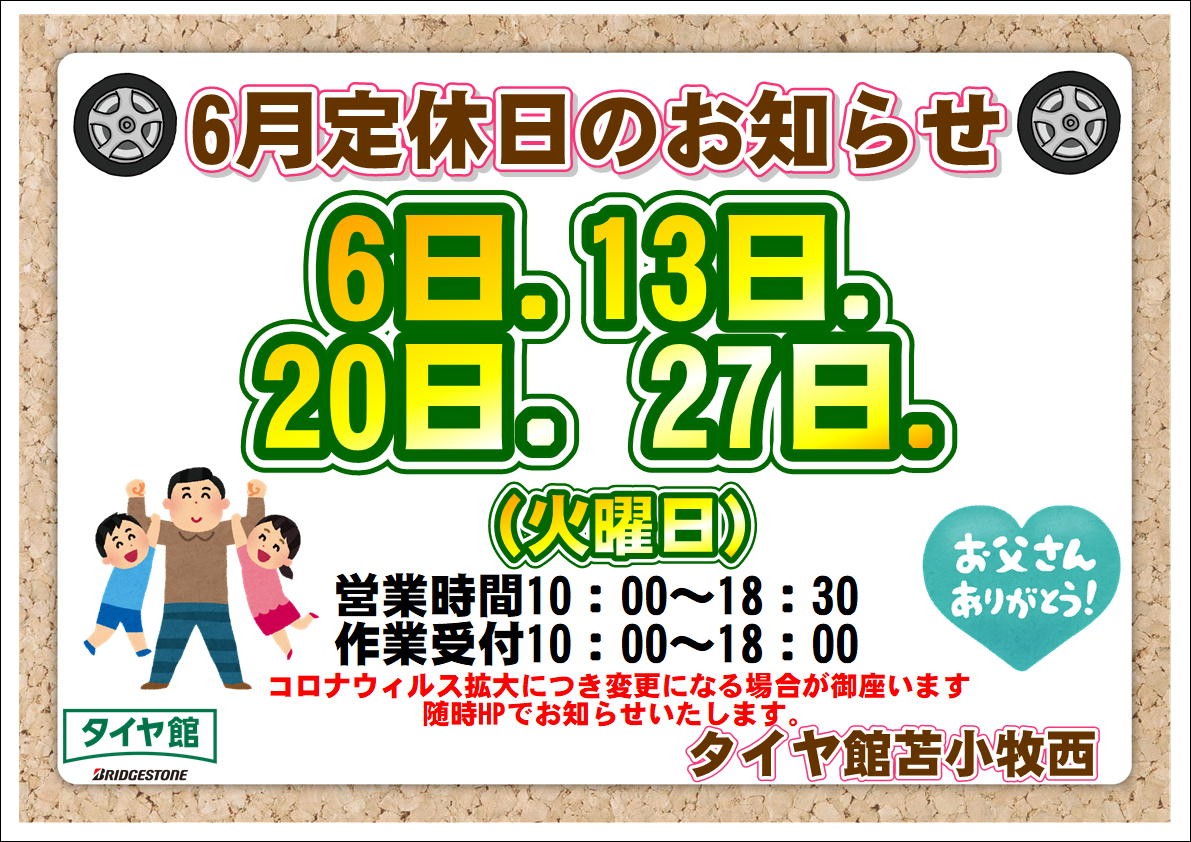 いつもタイヤ館苫小牧西店をご利用いただき 誠にありがとうございます。 2023年6月の定休日をご案内いたします。 6月 6日(火) 定休日 6月 13日(火) 定休日 6月 20日(火) 定休日 6月 27日(火) 定休日 ご来店の際はお間違えの無いよう たくさんのご来店を心よりお待ちしておりま...