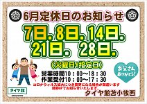 いつもタイヤ館苫小牧西店をご利用いただき 誠にありがとうございます。 2022年6月の定休日をご案内いたします。 6月7日(火) 定休日 6月8日(水) 定休日 6月14日(火) 定休日 6月21日(火) 定休日 6月28日(火) 定休日 毎週火曜の定休日に加えて、 【6月8日(水)】が定休日です。 ご来店...