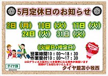 いつもタイヤ館苫小牧西店をご利用いただき 誠にありがとうございます。 2022年5月の定休日をご案内いたします。 5月2日(月) 定休日 5月10日(火) 定休日 5月17日(火) 定休日 5月24日(火) 定休日 5月31日(火) 定休日 ご来店の際はお間違えの無いよう たくさんのご来店を心よりお待ちして...