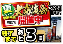 こんにちは! 店長のきむらです! タイトルにもありますが、 【夏タイヤ早期予約大商談会】本日を含めて、あと3日! 連日夏タイヤのご相談から、 冬タイヤのお話などたくさんのご成約をいただいております! まだまだ景品もご用意しておりますので たくさんのご来店を心よりお待ちしております!!...