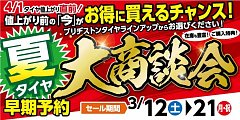 好評の「夏タイヤ早期予約大商談会」も明日が最終日となりました。 期間中は多くのお客さまにご来店頂き感謝の一言です。 明日の最終日も来店されたお客様に、納得して頂けるよう努力していきます。 最終日ながら成約プレゼントもまだ多数ご用意しております。 ちょっと写真が暗いですね‥ ちゃんと...