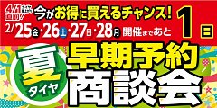 こんにちは! 店長の木村です! 大好評のこちらのイベントも本日が最終日!! 「0W-20」も「5W-30」もどちらも 在庫に限りがありますが、まだ間に合います!!! お休みの日を使って、オイル交換はいかがでしょうか? そして・・・・・・。 速報です!!! 2月中に夏タイヤの早期予約イベン...