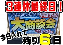こんにちは! 3連休最終日!! 昨日に引き続きいい天気です!! 11日から始まった大商談会も相変わらず好評でたくさんのお客様にご来店いただいています ありがとうございます! ただ、この大好評のイベントも今日入れて残り6日!! 次の週末の26日までとなります! 新商品の【VRX3】はもちろん【イ...