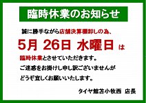 こんにちは(^^)/ お客様にお知らせがございます。 5月26日(水曜)は臨時休業となります。 皆様にはご迷惑をお掛け致しますが宜しくお願い致します。 5月25日(火曜)も定休日となっておりますので、営業は5月27日(木曜)になります。