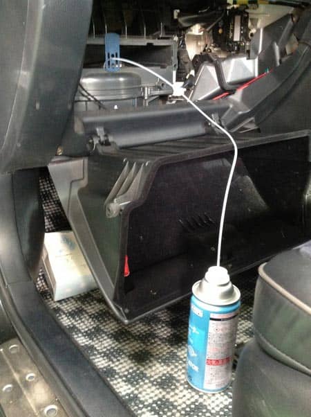 写真2 作業風景…ダッシュボードを外し、エアコンフィルターのトレイも外し、