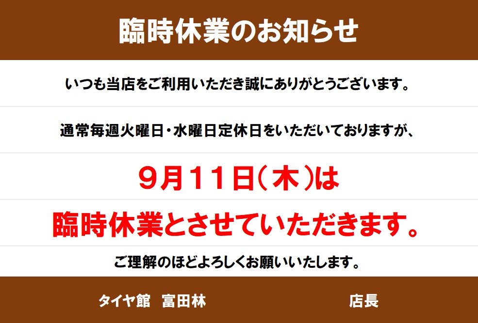 ★セール&フェアへの沢山のご来店誠にありがとうございました★ ポスト 2025年9月7日 タイヤ館富田林のホームページを ご覧頂き誠にありがとうございます。 この週末は【メンテナンスフェア】と 【スーパータイヤセール】へ 沢山のご来店誠にありがとうございました。 引き続きお得なフェア&セールは開催致します。 9月度臨時休業のお知らせです。 ※通常毎週火曜日・水曜日に定休日をいただいておりますが、 9/11(木)は臨時休業とさせていただきます。 いつもご利用いただいている皆様には 大変ご迷惑をお掛け致しますが 何卒よろしくお願いいたします。 タイヤ館 富田林 住所:584-0025大阪府富田林市若松町西1丁目1810-1 電話番号: 0721-24-0886 タイヤ点検・安全点検/タイヤ履き替え/オイル交換/その他ピット作業の予約 カテゴリ:お知らせ その他