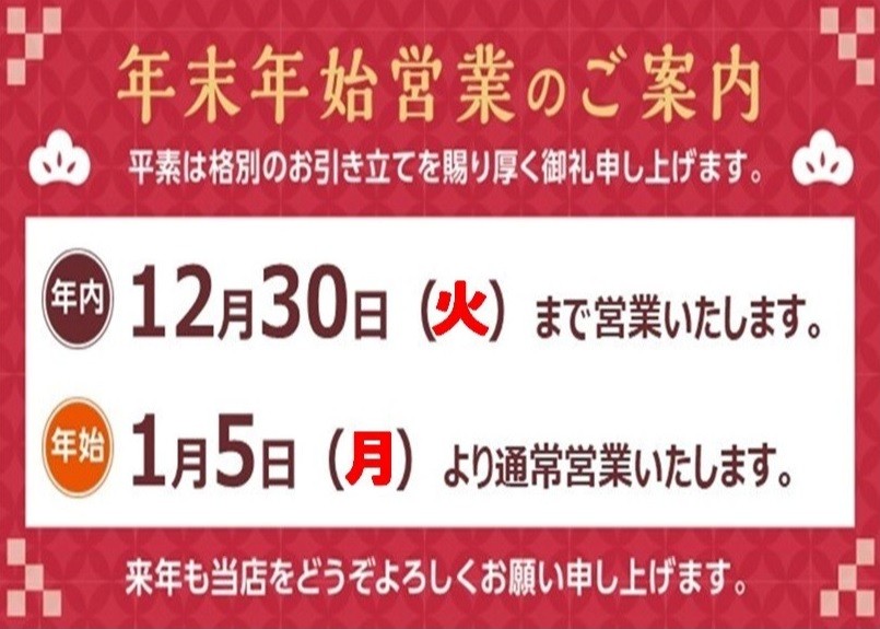 年末・年始 営業のご案内です!