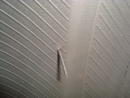 後輪に刺さっていて、おそらく前輪で撥ねた釘が