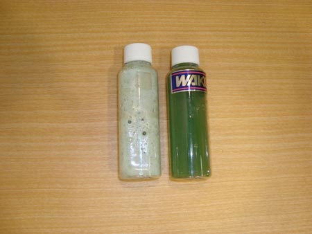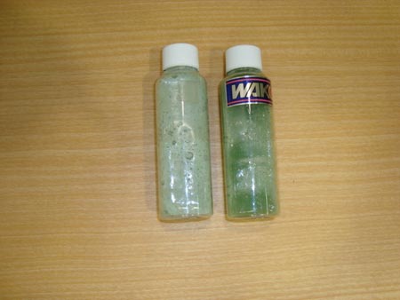 写真の右はクーラントブースターを注入したラジエーター液。