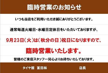 タイヤ館富田林のホームページを ご覧頂き誠にありがとうございます。 9月度臨時営業のお知らせです。 ※通常毎週火曜日・水曜日に定休日をいただいておりますが、 9/23(火曜日)は(秋分の日)祝日になりますので、 臨時営業とさせていただきます。 皆様のご来店 スタッフ一同心よりお待ちいたして...
