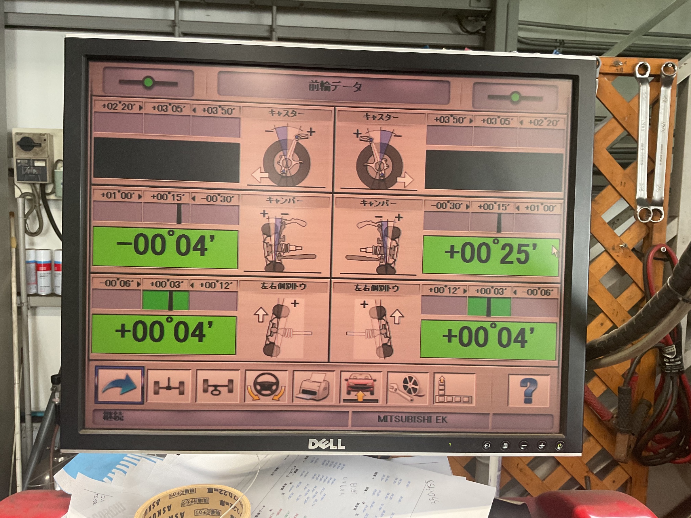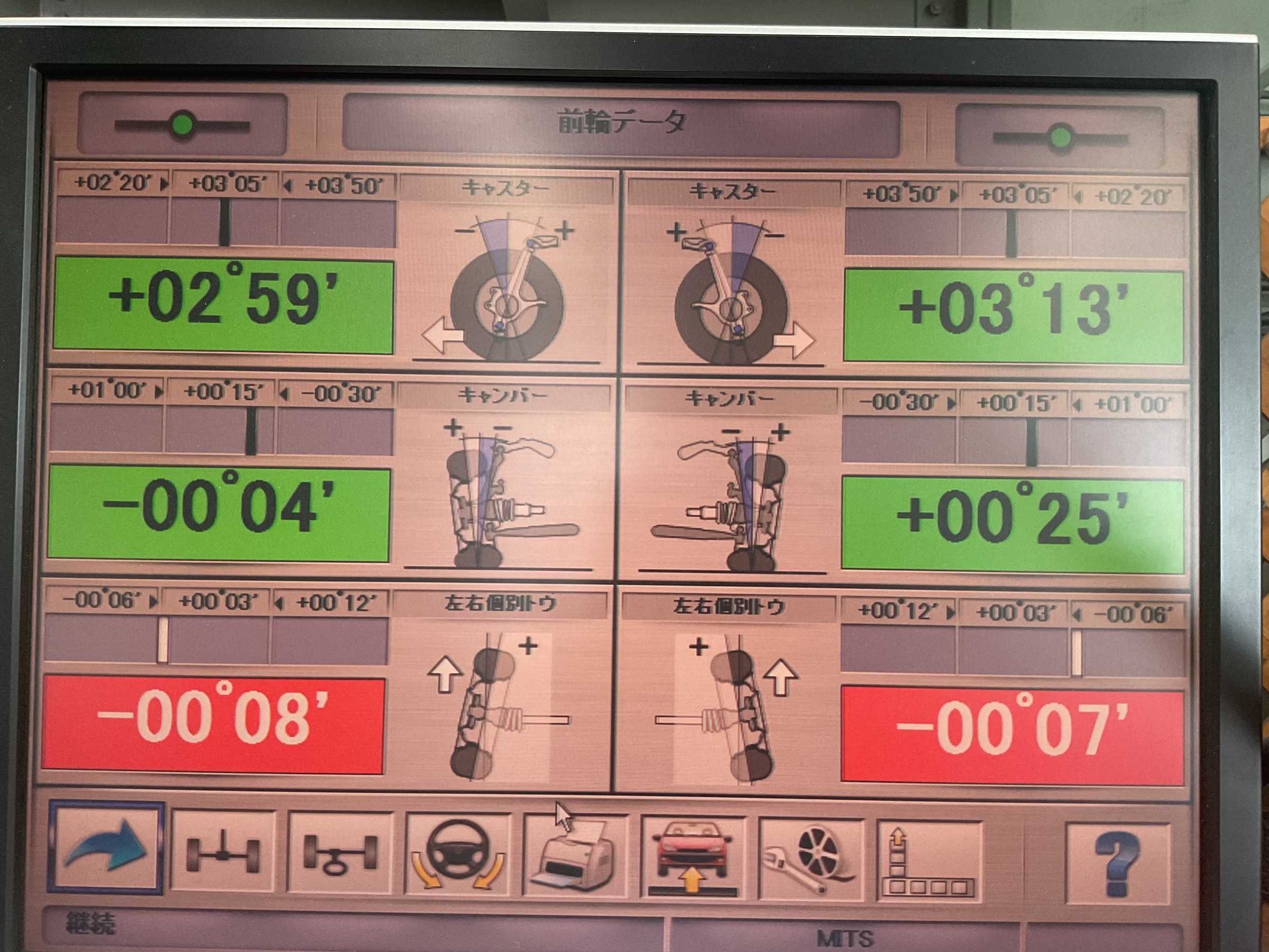 一番下の「左右個別トウ」が異常値に、これは前輪のつま先の角度を示しています。