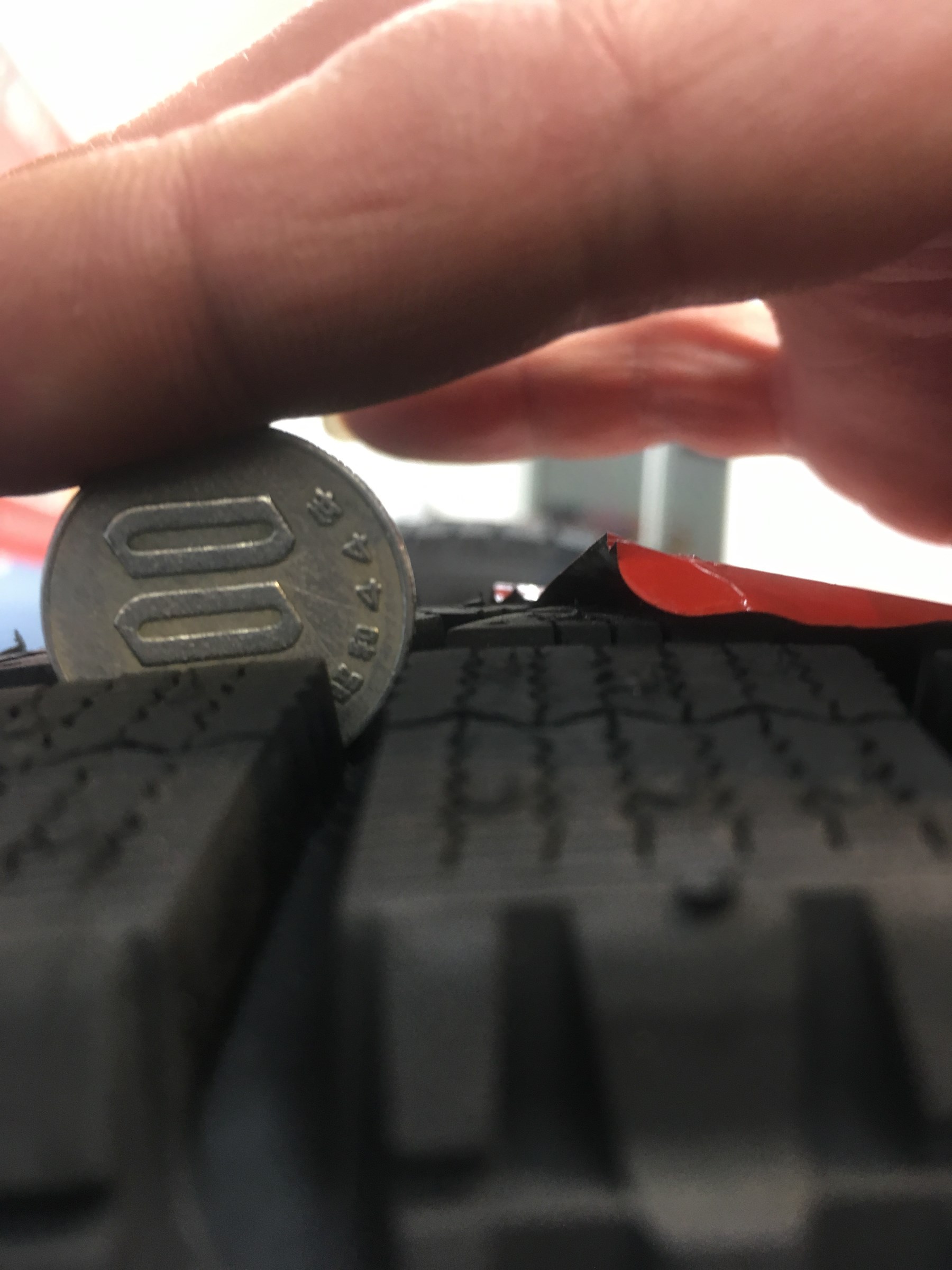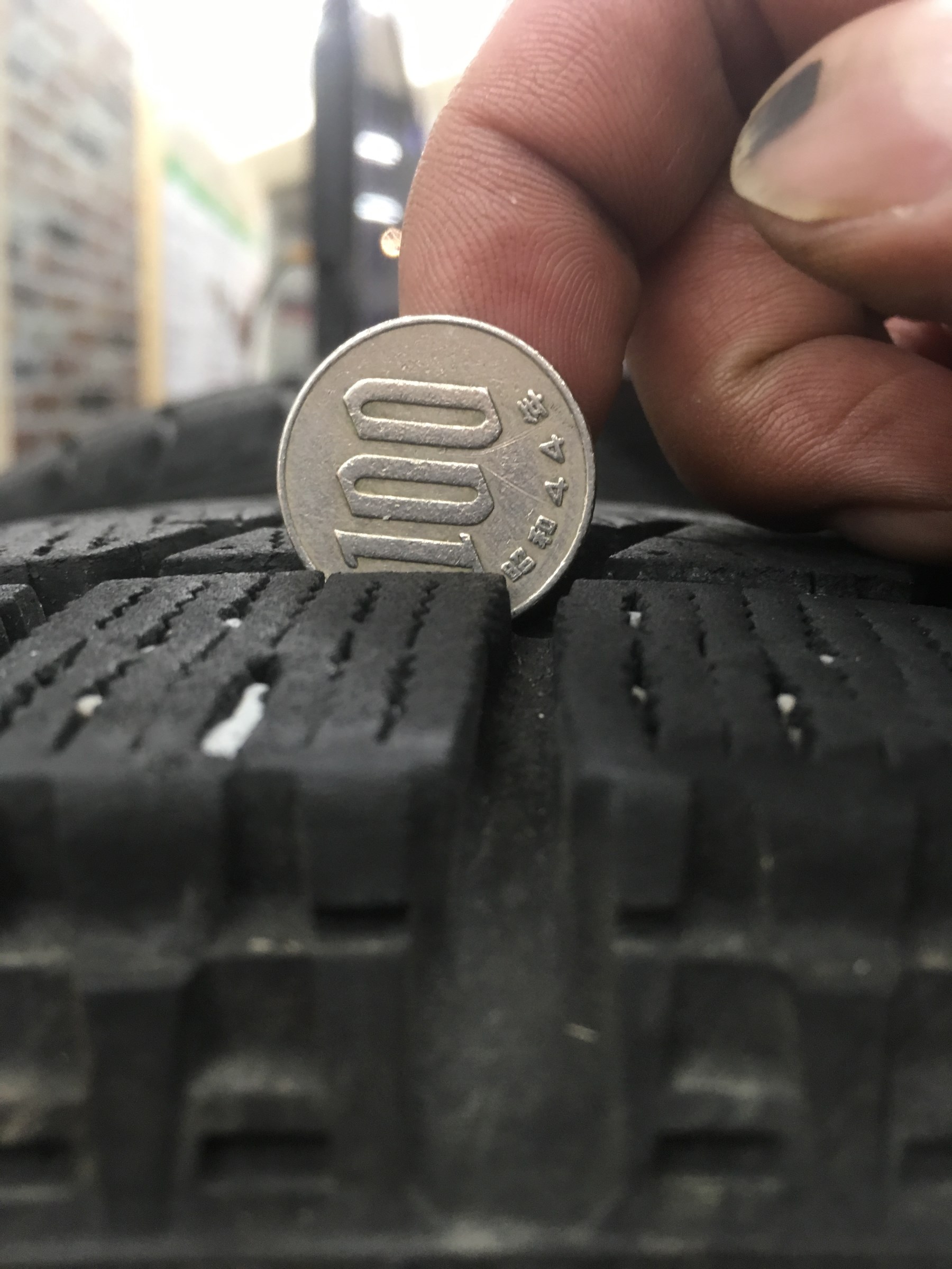 これは新品タイヤの溝に100円玉差し込んで1の文字がかくれていますね。