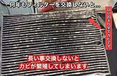 こんにちは! 今日はかなり暑い日になったので車を運転する方は、 エアコンをつけて運転されたかと思います 長い間交換を忘れていると この様にカビが繁殖してしまいます!! そして繁殖してしまってのがフィルターの裏側だったので 気が付かない間に車の中に流れる空気に カビが含まれてしまってい...