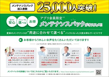 皆さんこんにちはタイヤ館屯田です(^^)/ オイル交換にかかる費用を抑えたい! 忘れがちなオイル交換時期をアプリが教えてくれる! これまで加入されていた方も、再加入していただけるリピーターさんも多い 「 メンテナンスパック 」 これまでは ” 1年 ” というパック期間でしたが、” 2年 ” のパック...