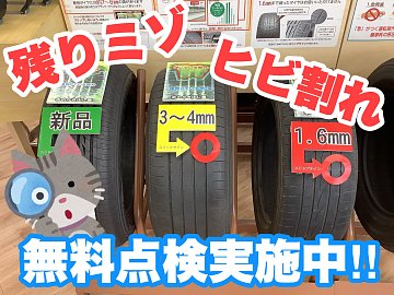 タイヤ館では無料でタイヤの点検ができちゃいます! 空気圧点検はもちろん、 タイヤの残溝やひび割れなどの状態も確認できますよ! 『このタイヤまだ安全?』『なんだか空気圧が低い気がする』などなど、 少しでも心配ごとがあればいつでも点検にご来店ください♪ タイヤだけでなくエンジンオイルや...