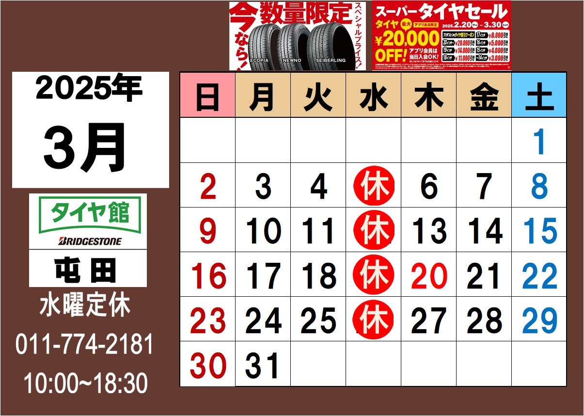 3月の営業日をお知らせいたします"(-""-)" 3月のセール 2025年2月20(木)~3月30日(日)SUPERタイヤSALE(開催中) 2025年2月20日(木)~3月16日(日)夏タイヤ早期予約大商談会(開催中) SUPERタイヤSALEはコチラ 上記SALE同時開催中です( `ー´)ノ タイヤがお得に変えるチャンス?! タイ...