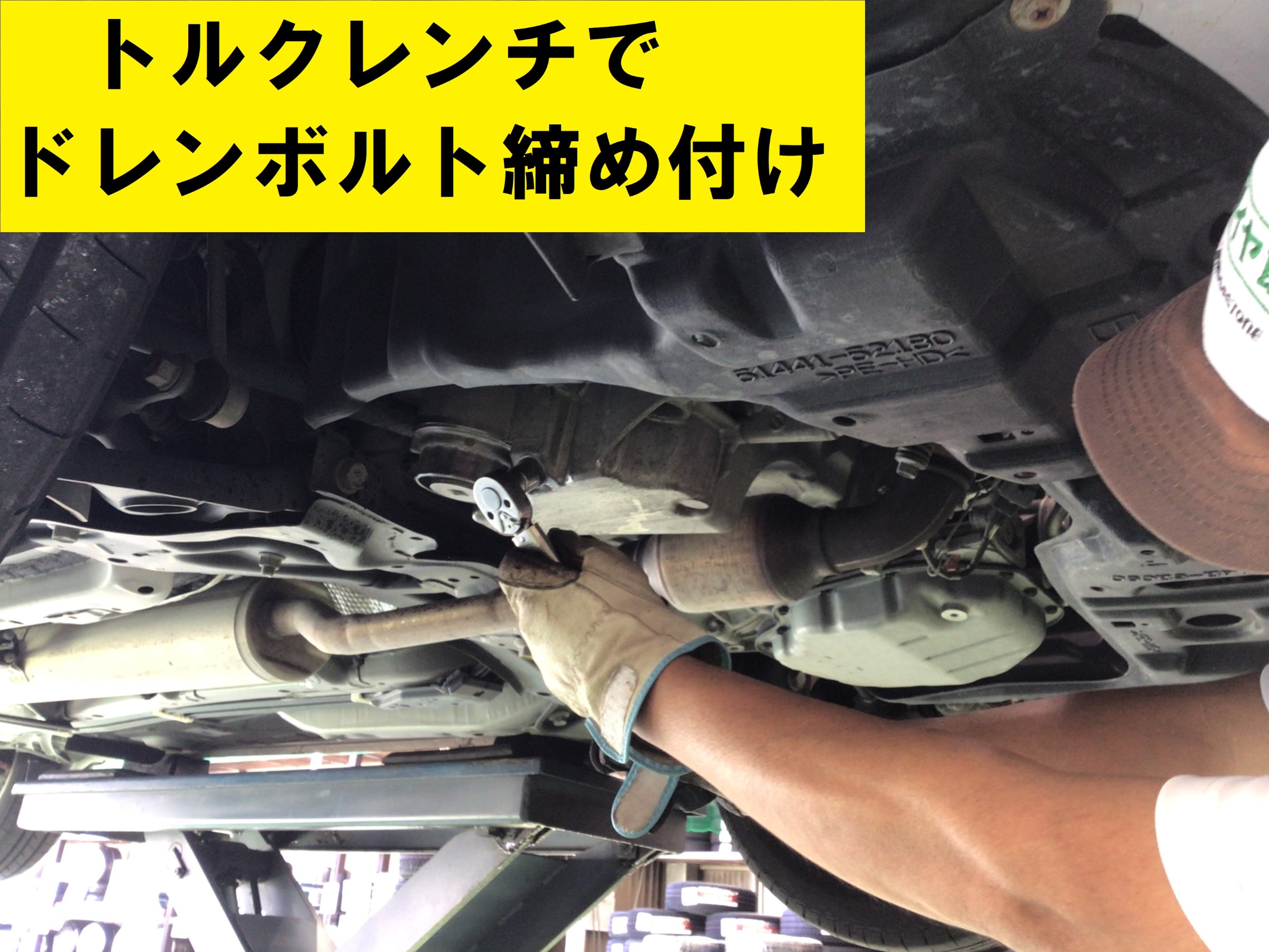 車両をリフトアップしてエンジン下のオイルパンからオイルを抜いて、エレメント交換を行います