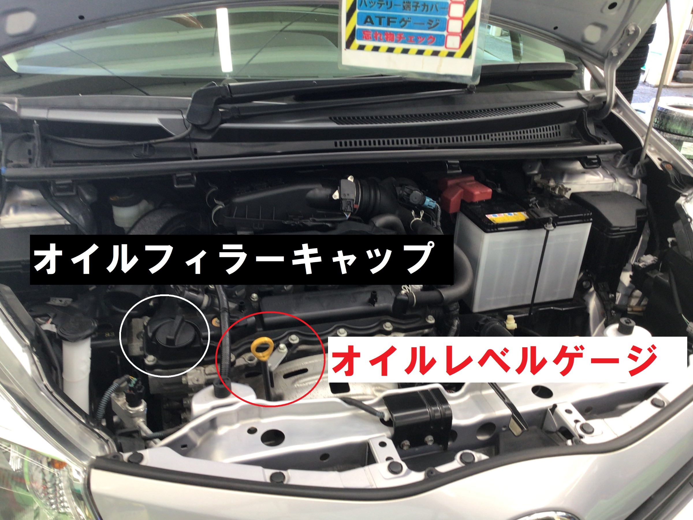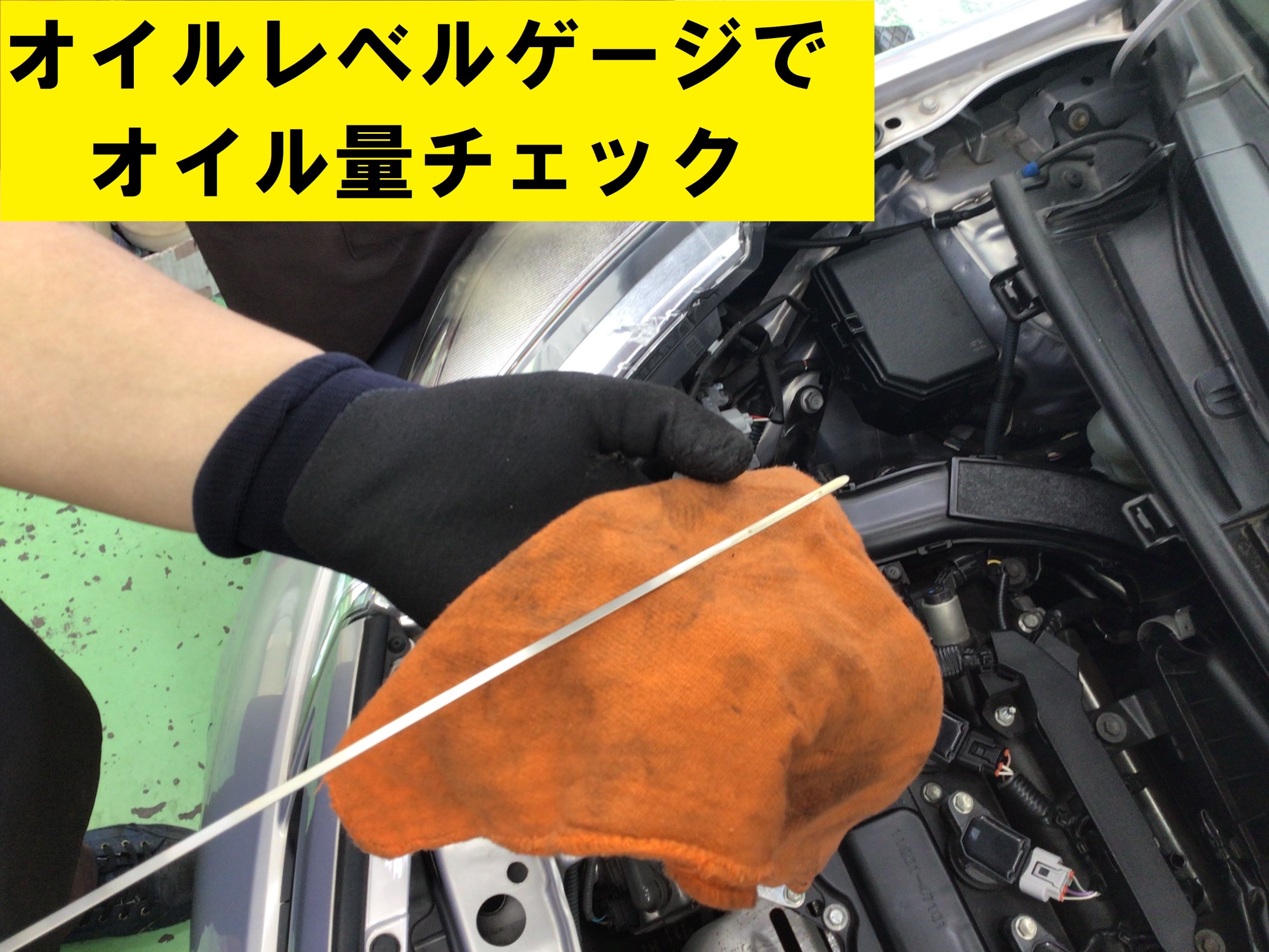 注入が終わったら赤丸のオイルレベルゲージで…