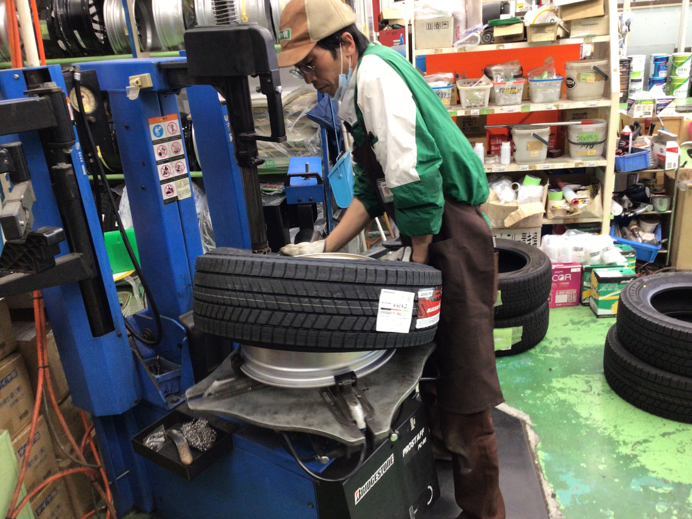 ↑梅原スタッフが予約分のスタッドレスタイヤを組んでくれています!