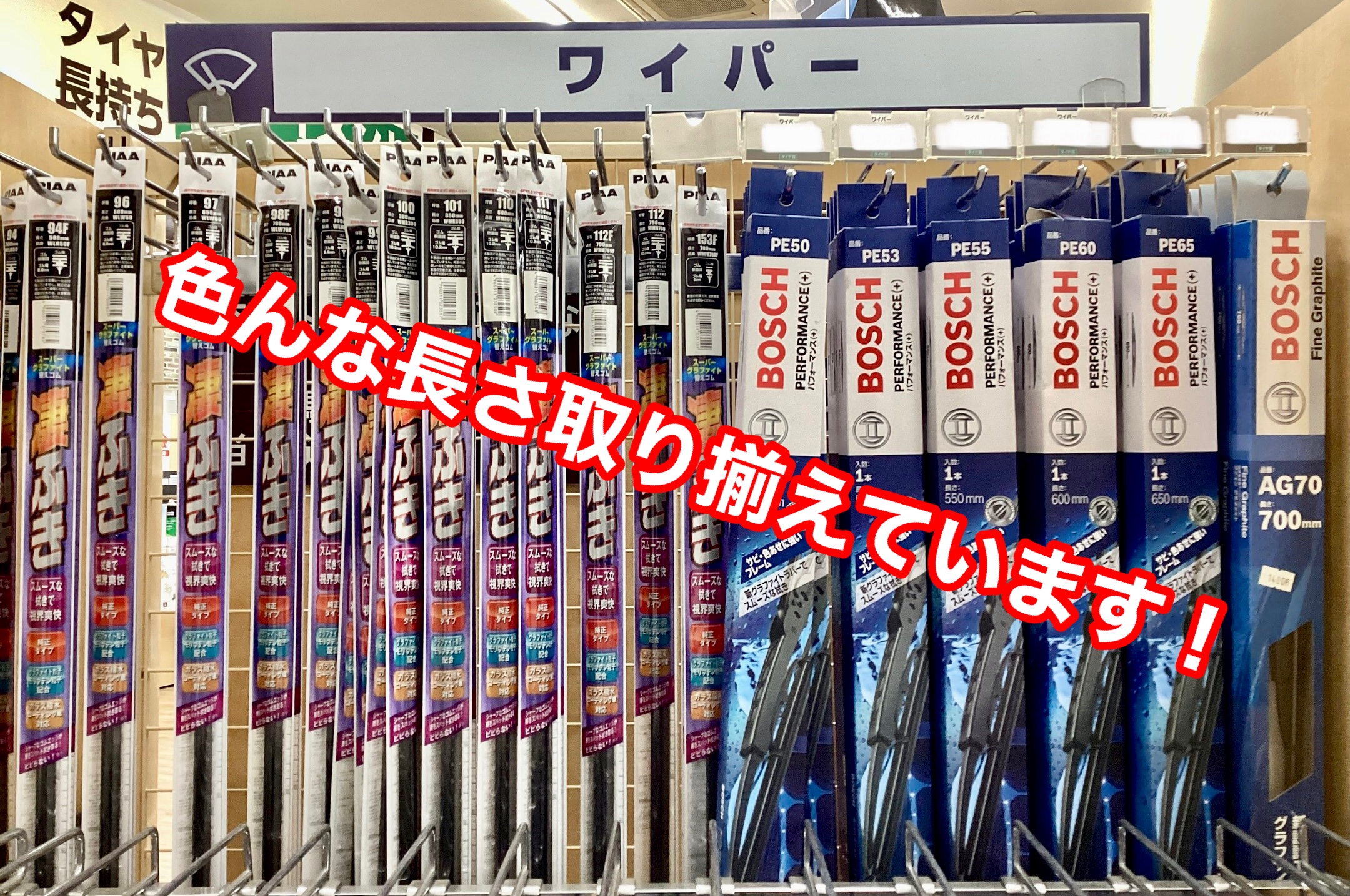 ワイパーは車種よって様々な長さがありますが、当店では大体のサイズは在庫しております。