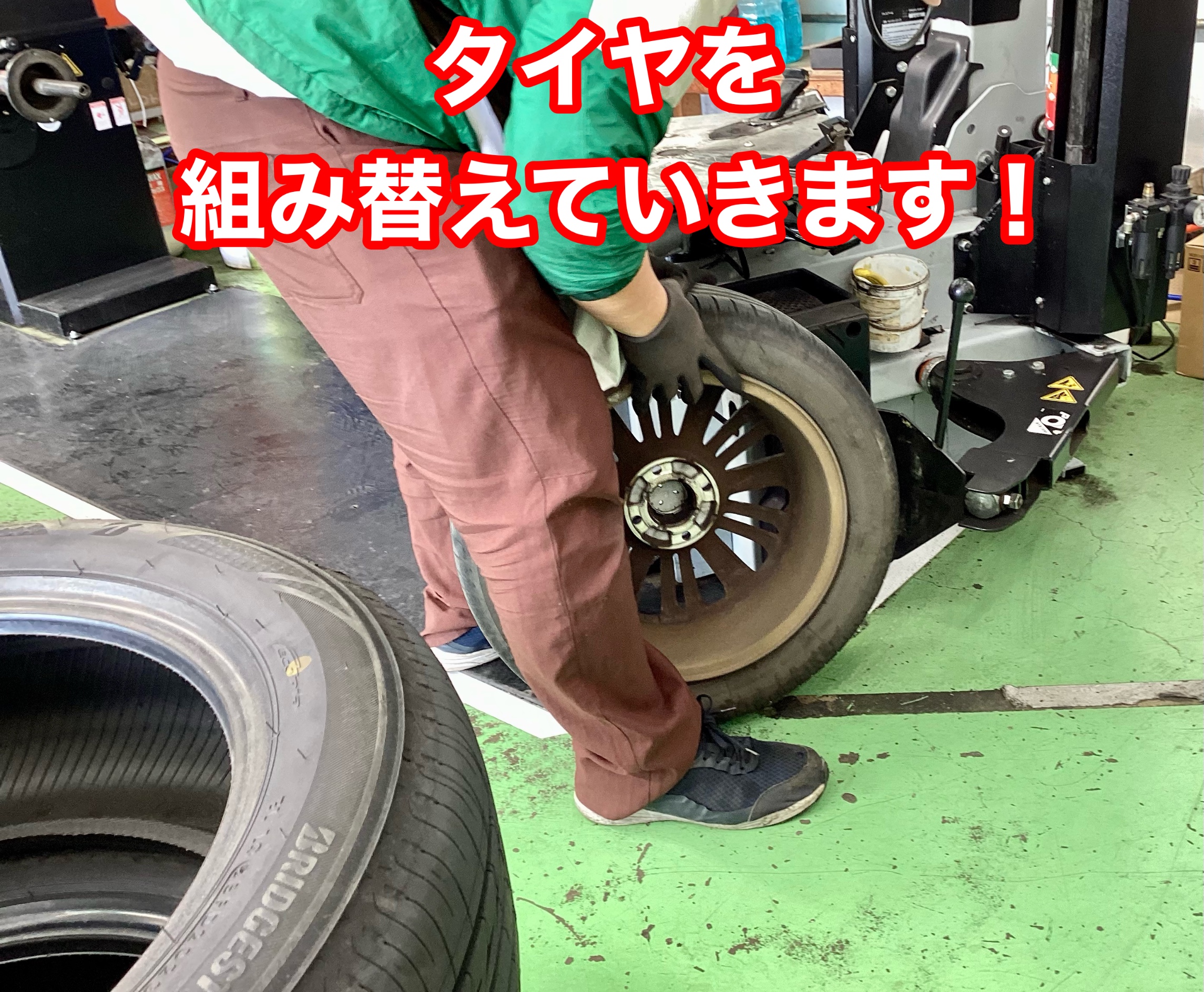 タイヤチェンジャーで古いタイヤを外して新品を組付けていきます!
