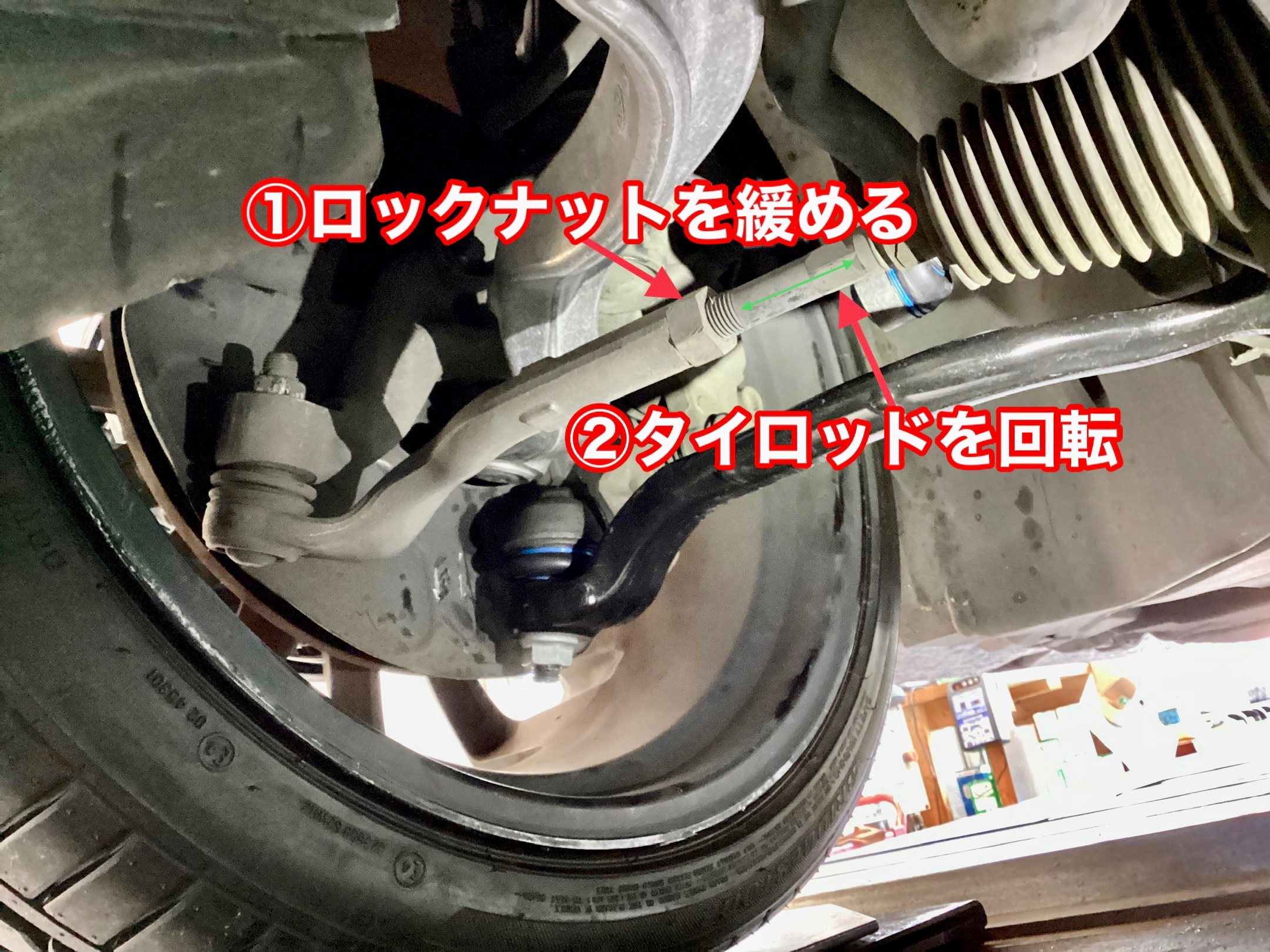 前輪トーの調整はタイロッドという部品の長さを変更して行います。