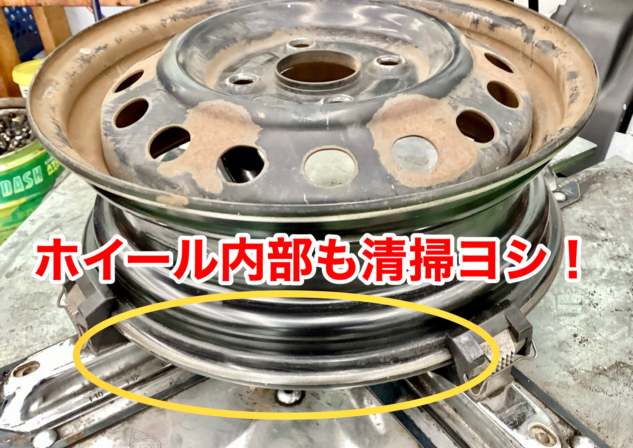 ホイールには古いタイヤのカスが付着しているのでキレイにしてから新品タイヤを組付けます!