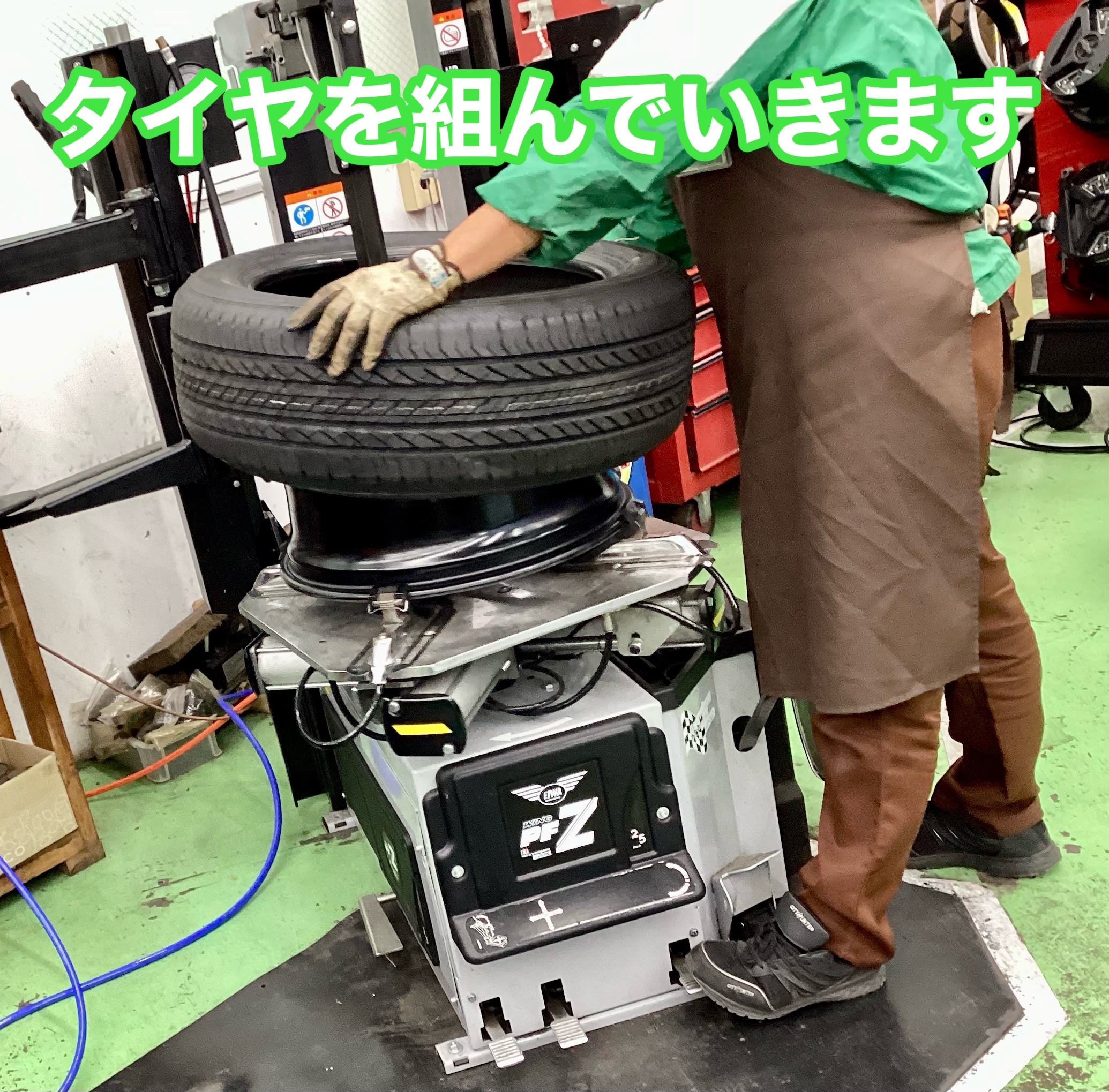 エアバルブを交換し、ホイールを清掃したら新品タイヤを組付けていきます。