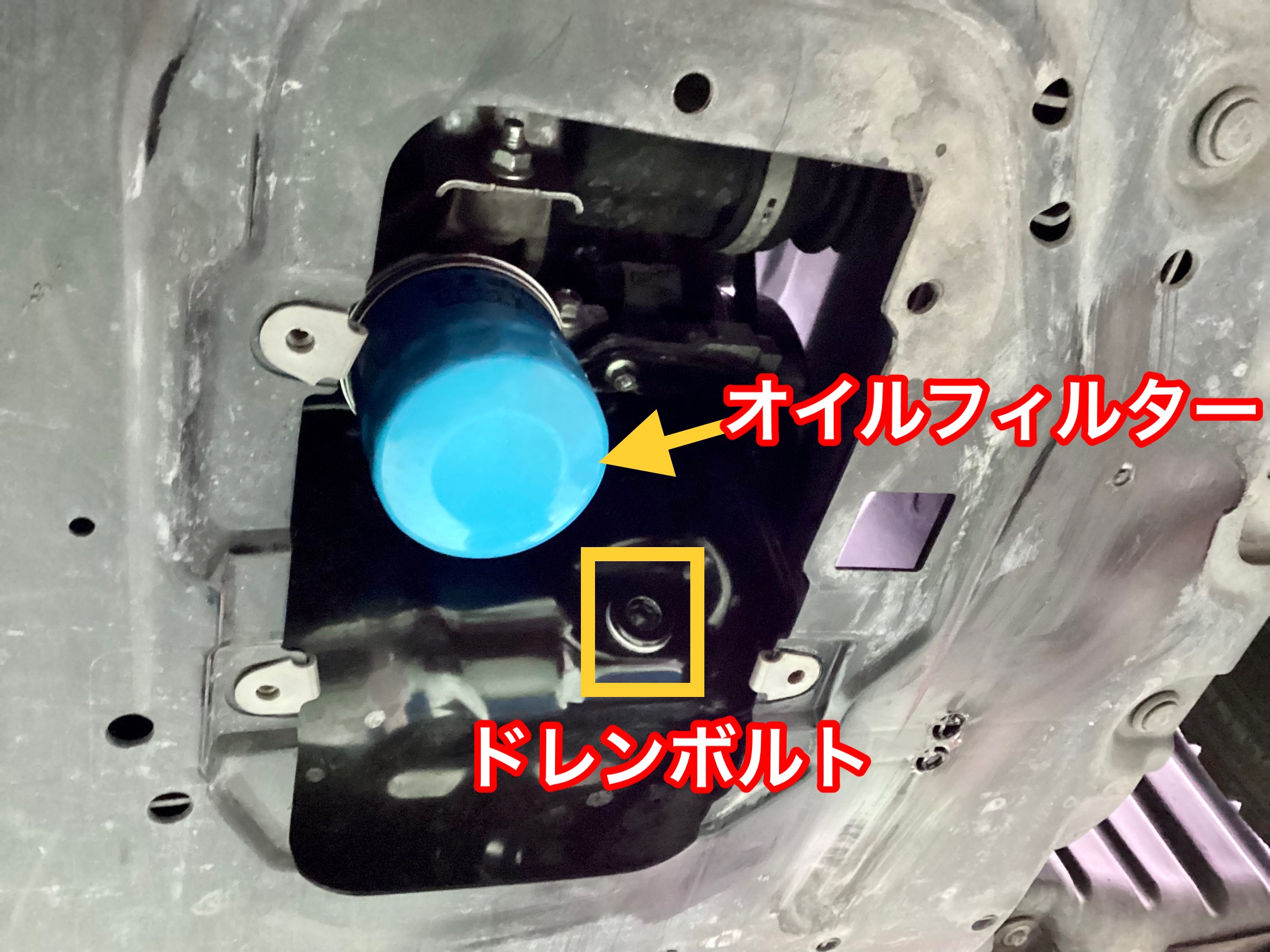 それを外すとオイルパンのドレンボルトとオイルフィルターが見えてきます。