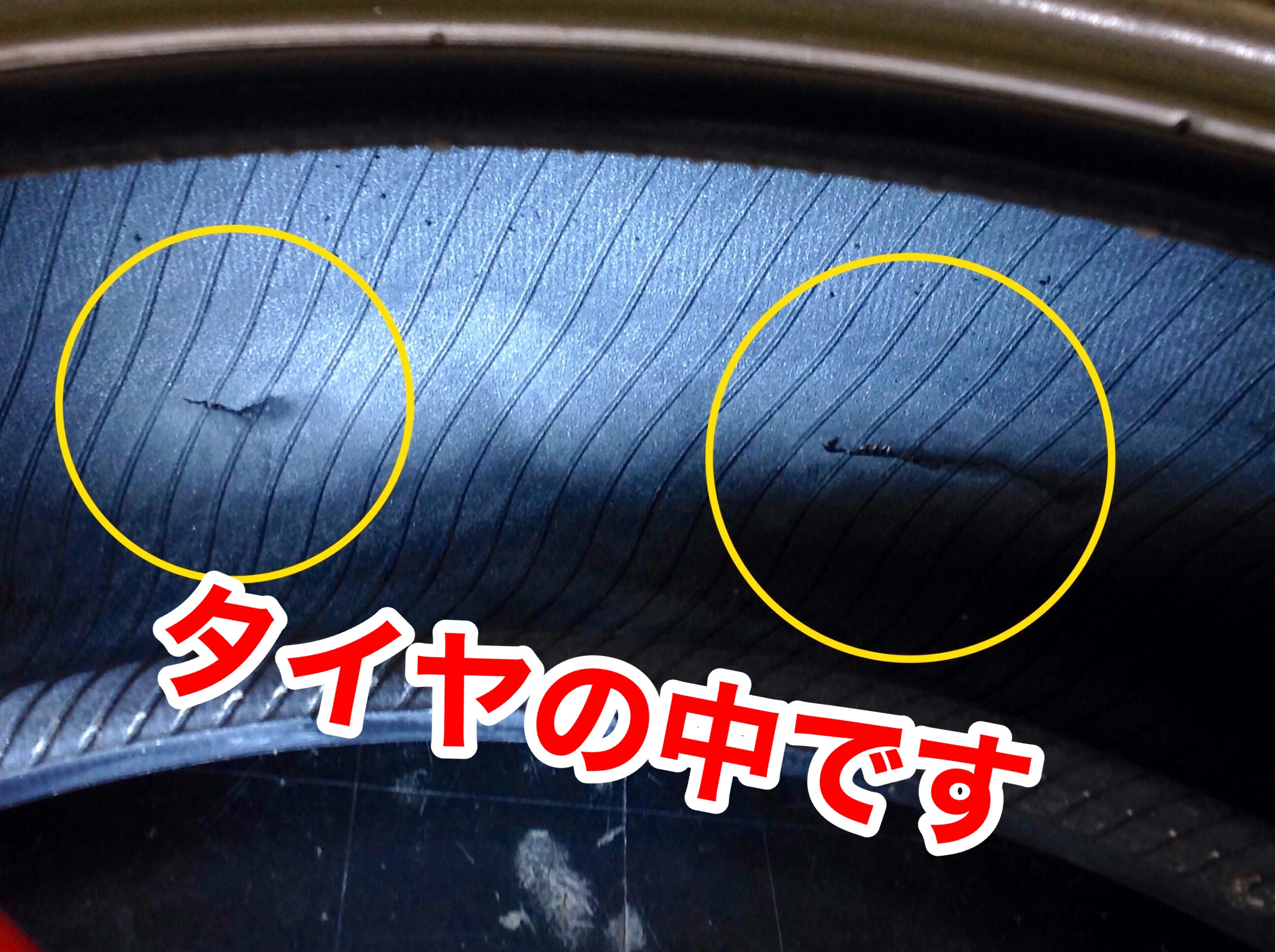 先ほどのタイヤ側面のコブ2か所の内側はこんな感じで裂けてしまっているんです。