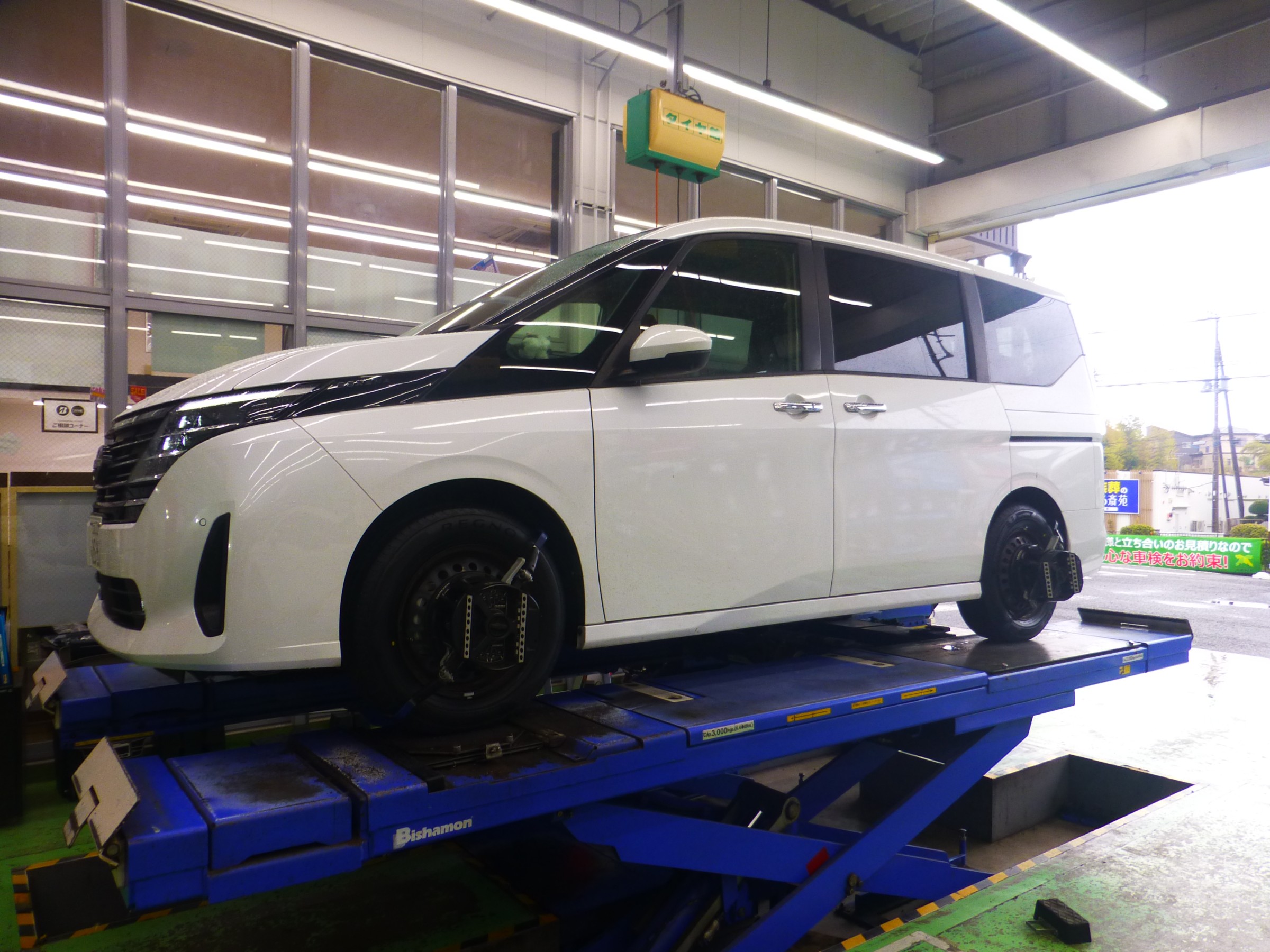 【ニッサン C28 セレナ】タイヤ交換、アライメント調整を行いました。