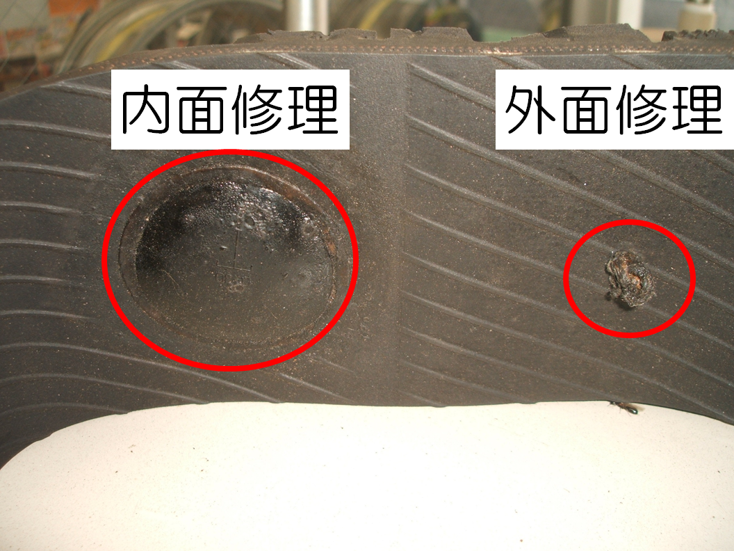対して、内面修理はタイヤの内側からしっかりと修理剤で覆われており、再発リスクがとても低いのが特徴です。