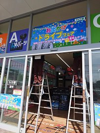 足だけ見えますね、誰でしょう。 この場所のPOP類は背の高い人じゃないと、なかなか難しいんです。 そんなわけで、殿岡課長と安齋スタッフにお願いしました。 タイヤ館取手ではただいま『お出かけドライブフェア』を開催中です! ゴールデンウィーク、ご予定のある方も、ない方も、お車のメンテナン...