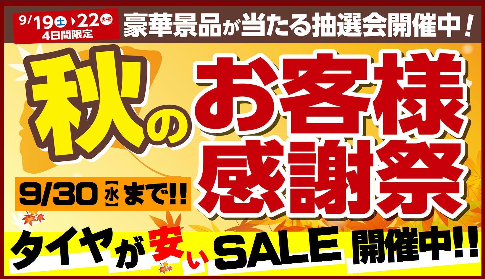 9/19(土)~9/22(火)の期間にタイヤ4本お買い上げ頂いたお客様は