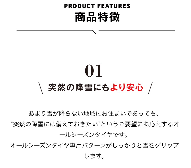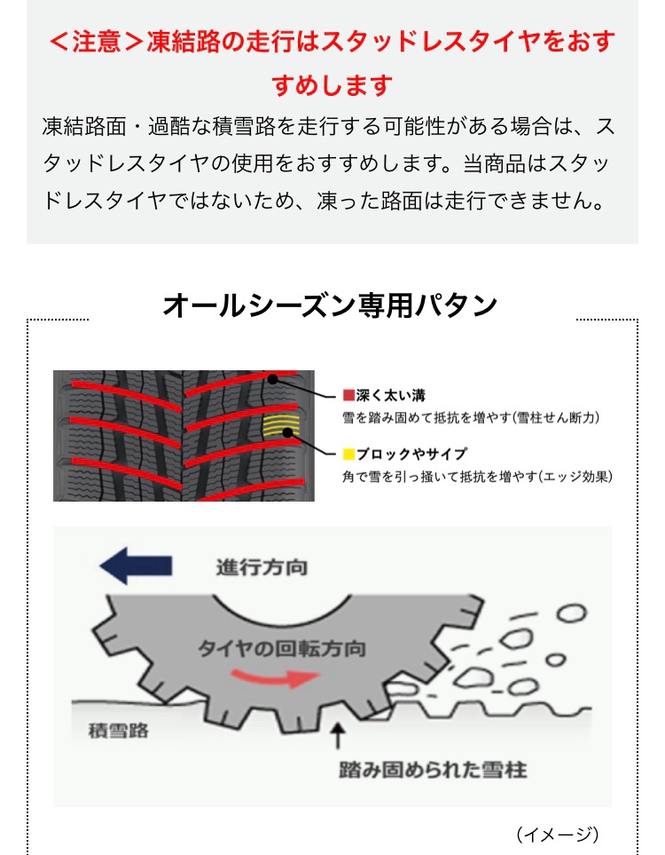 ・雪を含むすべての天候で使えるタイヤではありますがスタッドレスタイヤではありません。過酷な積雪、凍結路面を走行する可能性がある場合はスタッドレスタイヤのご使用を推奨いたします。