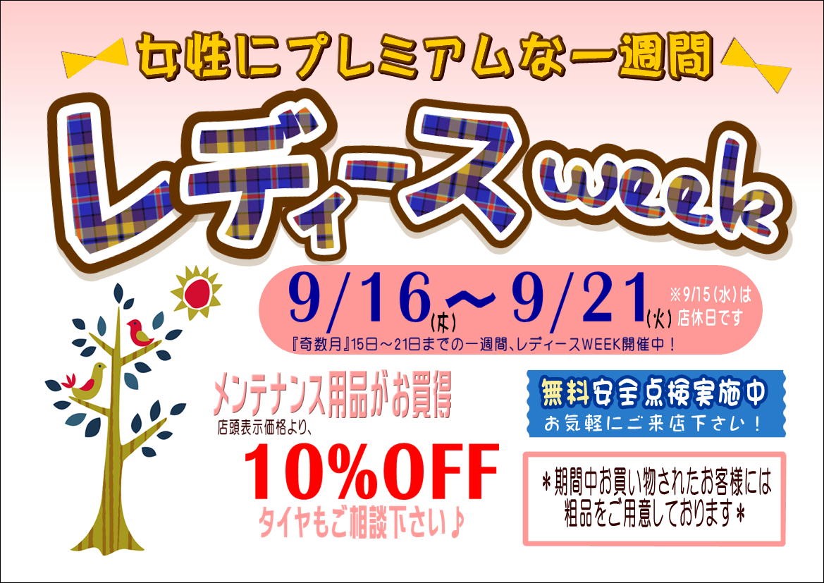 ★9/16(木)~9/21(火)★レディースWeek開催します♪ ポスト 2021年9月14日 9月のレディースウィークのお知らせです(^^)/ 9/16(木)~9/21(火)の1週間で 女性の方にお得な「レディースウィーク」を開催致します♪ この期間だとタイヤはもちろん オイル・バッテリー・ワイパーなどのメンテナンス商品がお得になります! ★☆!メンテナンス商品10%OFF!☆★ さらに この期間にお買い上げ頂くと 粗品もついてきます♪ タイヤやメンテナンス商品もお得なこの期間にお越しください♪ 皆様のご来店お待ちしております^^ カテゴリ:お知らせ