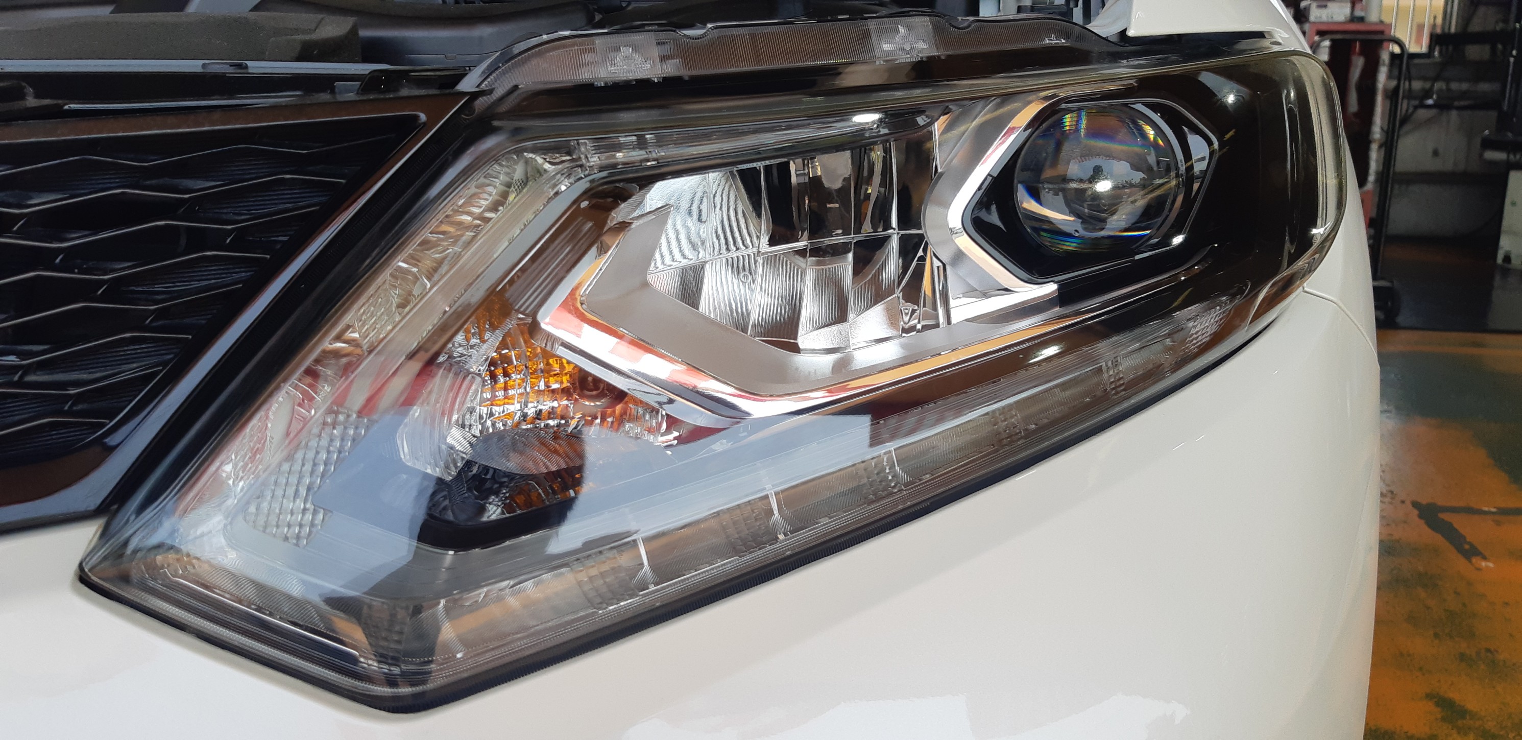 近年の車のヘッドライトレンズはほとんどが樹脂製で、紫外線や点灯時の熱の影響による経年劣化で
