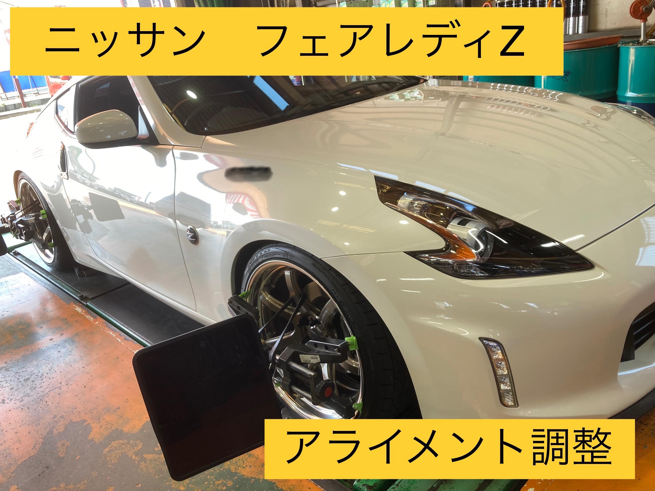 ニッサン フェアレディZ アライメント調整!※車高調整後、内側の減り方がおかしく、タイヤの消耗が早かったので、キレイに減ってもらい為!