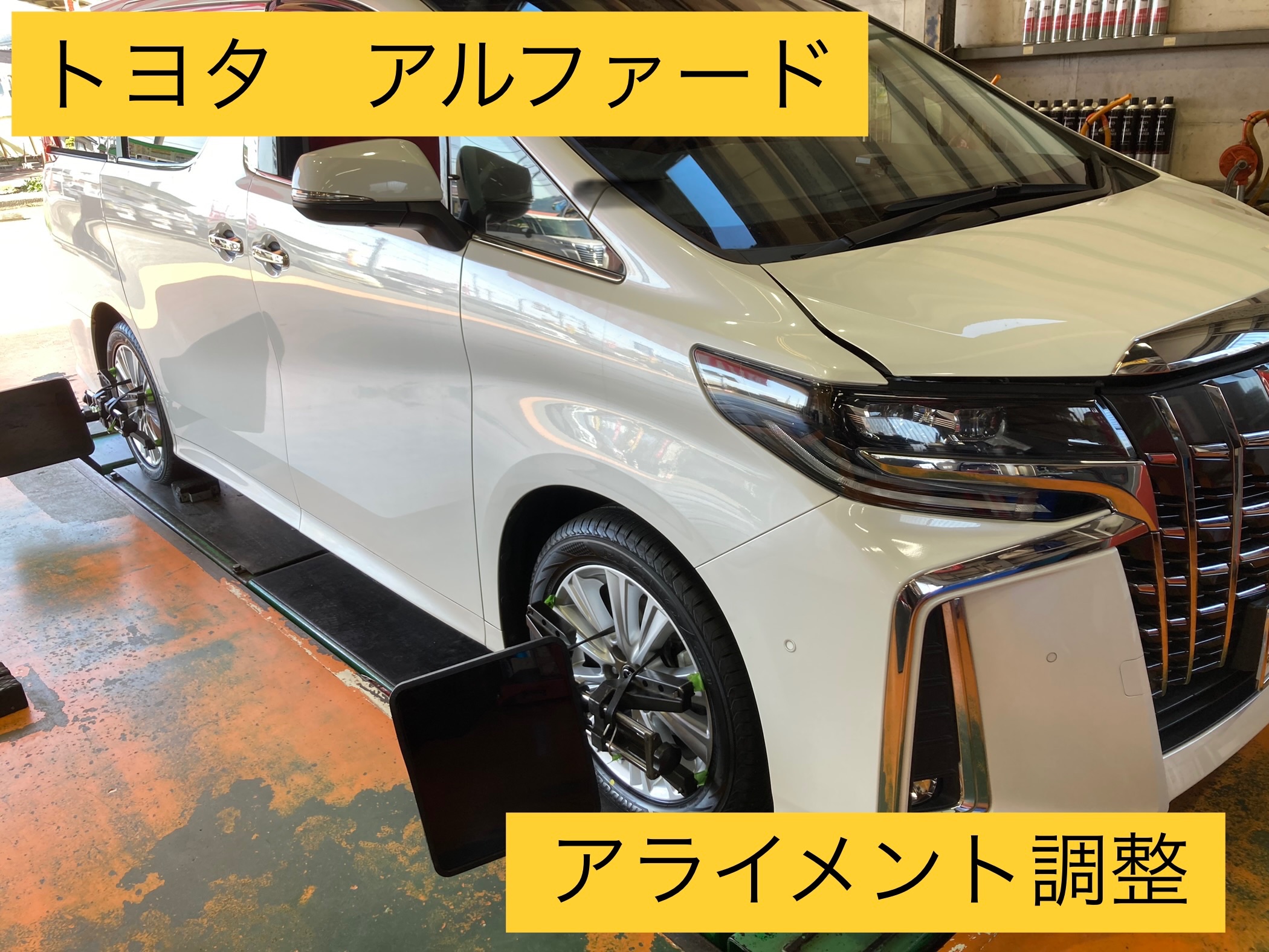 トヨタ アルファード アライメント調整!※車高調整後、内側の減り方がおかしく、タイヤの消耗が早かったので、キレイに減ってもらい為!