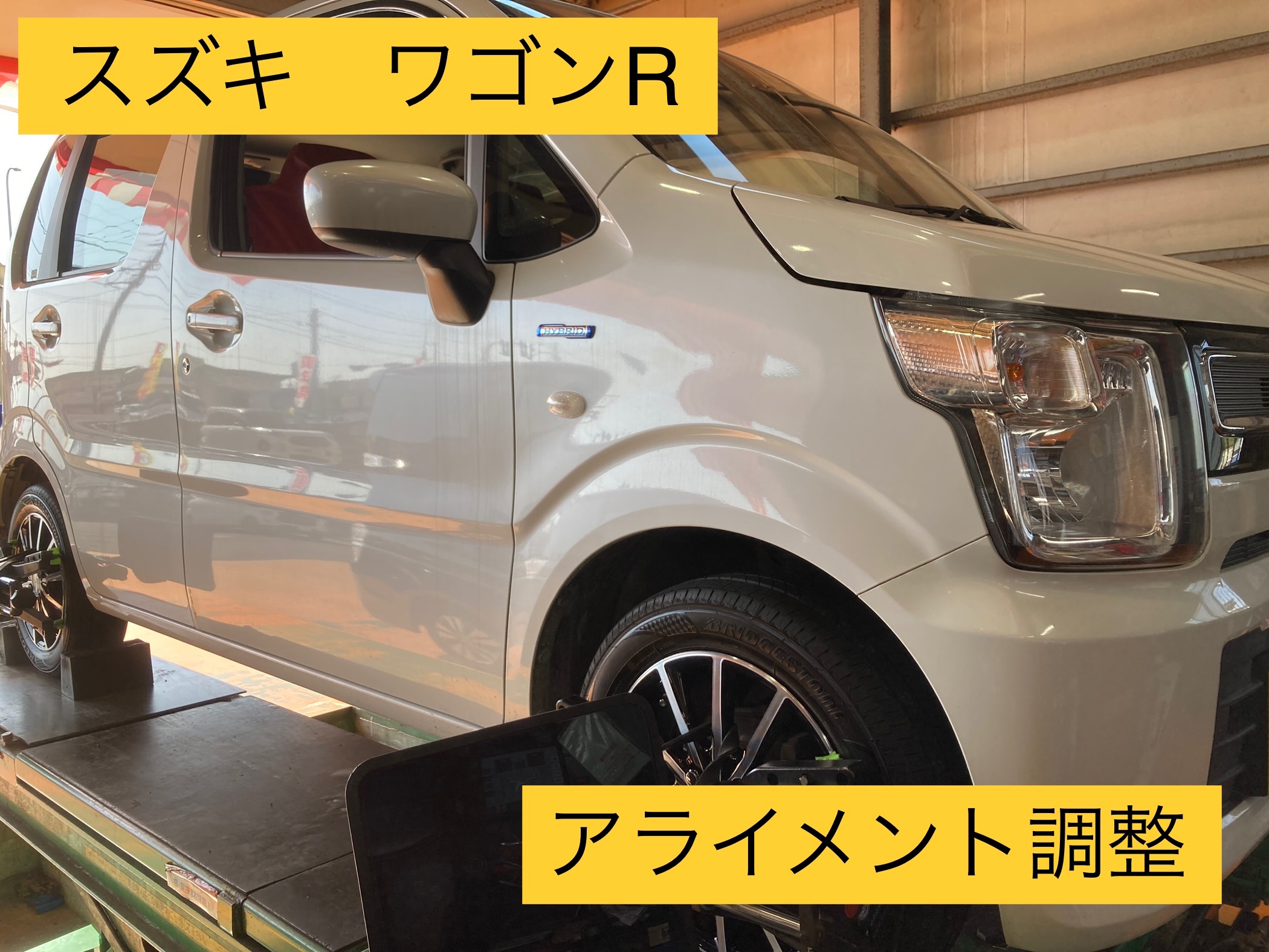 スズキ ワゴンR アライメント調整!※新車装着タイヤから2年経ちましたが、内側の減り方がおかしく、タイヤの消耗が早かったので、キレイに減ってもらい為!