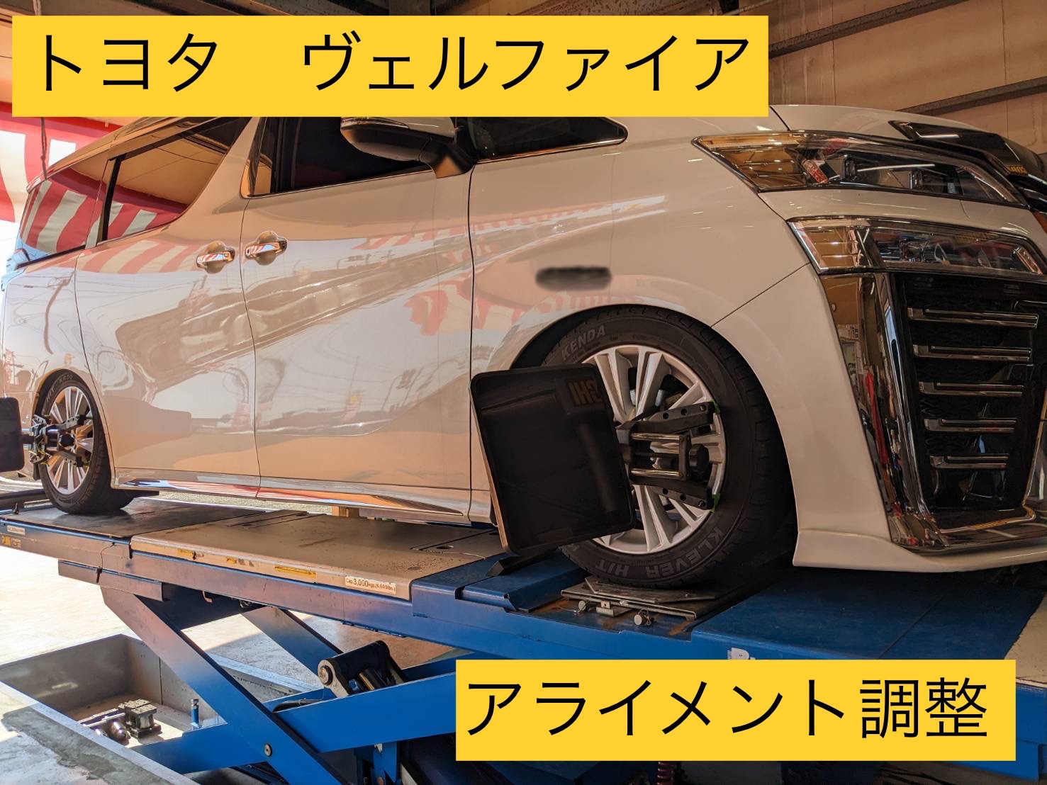 トヨタ ヴェルファイア アライメント調整!※内側が外側に比べて早く減っている。タイヤをキレイに使用し長持ちをしてもらい為!