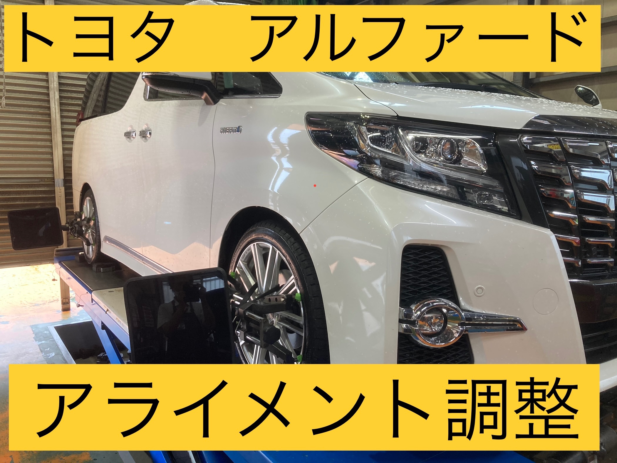 トヨタ アルファード アライメント調整!※左前のタイヤが変な減り方をしている為。一度縁石に乗り上げ、それからハンドルが少し右に傾いているので、ハンドルを真っ直ぐに調整をし、偏摩耗の抑制になる為!